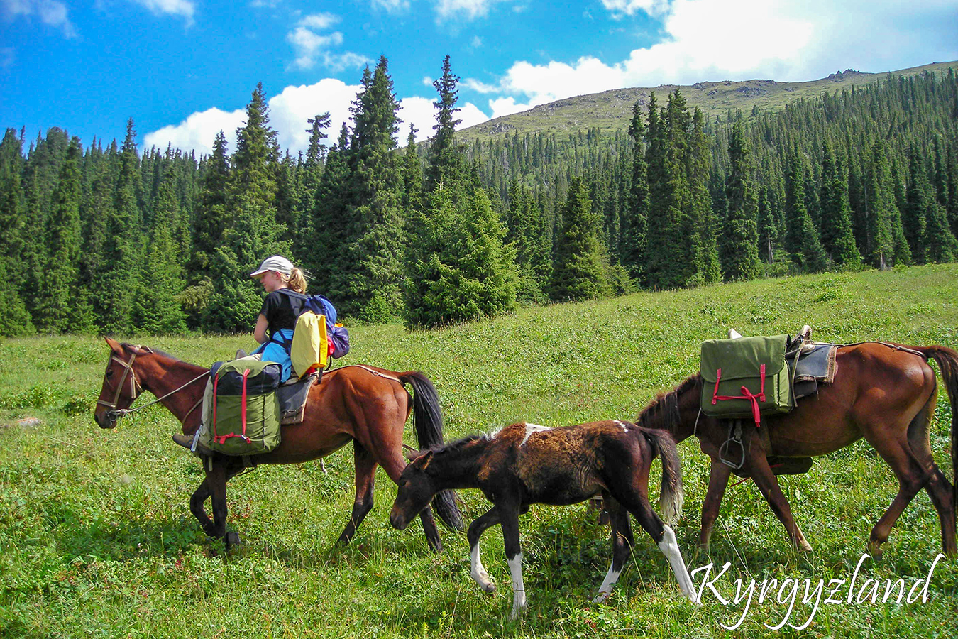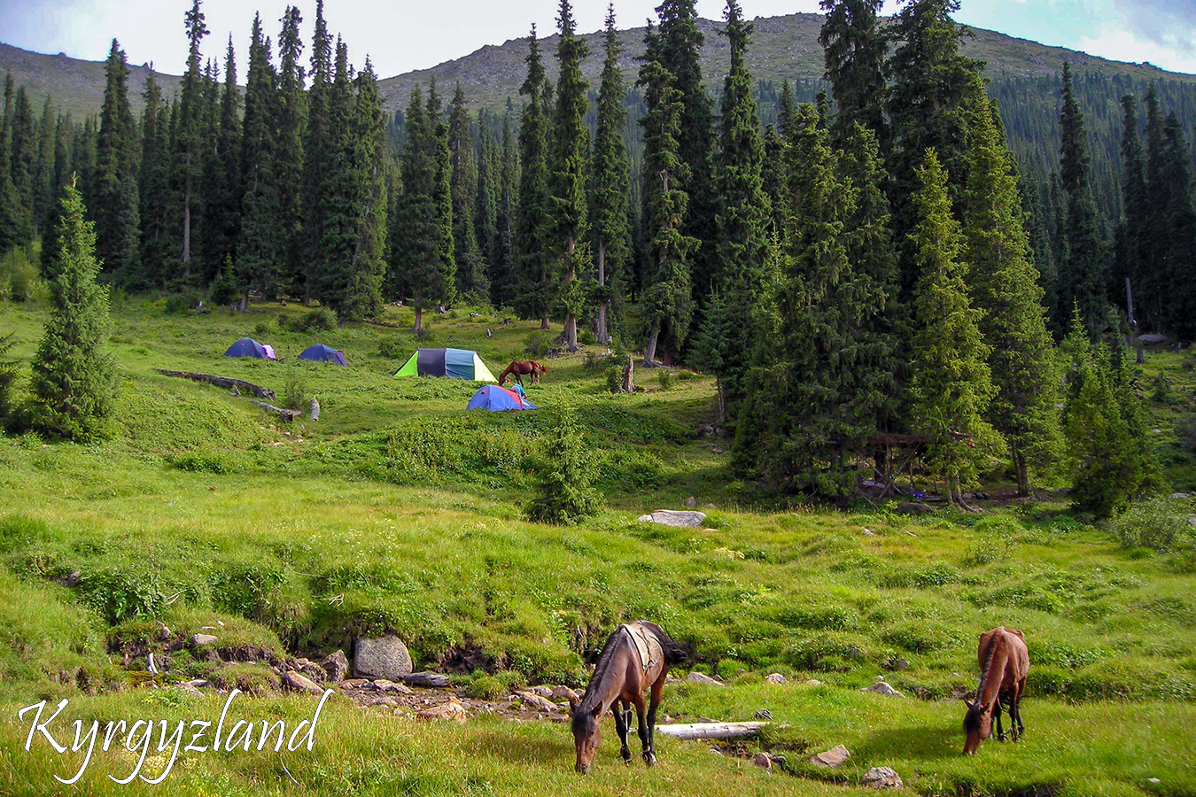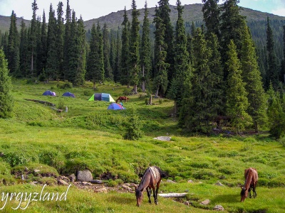 Riding along Tamga gorge to the former mountain base. Putting camp on plateau, near fir forest. Overnight in tents.